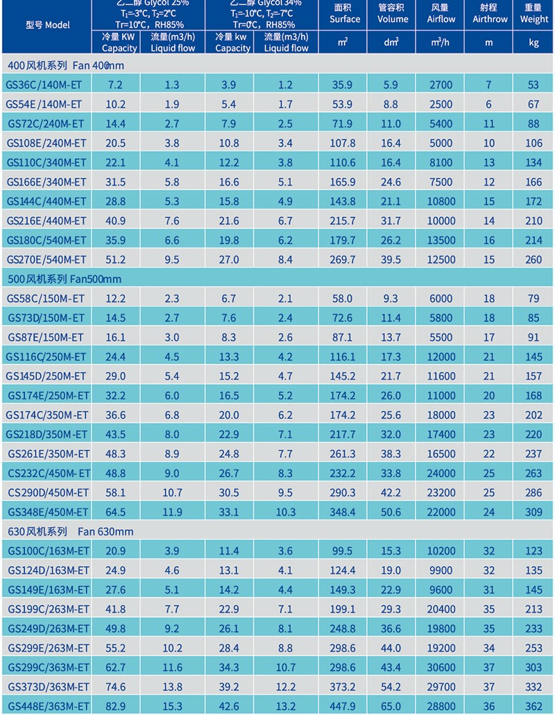 The GS series industrial glycol air coolers is mainly used for cooling equipment in cold storage with glycol coolant. The low temperature glycol aqueous solution in the heat exchanger tube of the air cooler to absorb the external heat so as to reduce the storage temperature. The GS series air cooler can be used in cold storage at about 10°C, 0°C and -18°C respectively